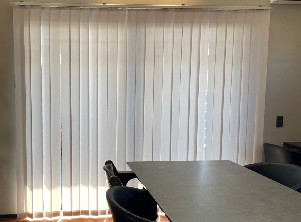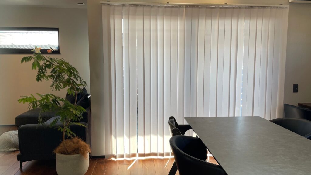 縦型の羽根がつらなっているバーチカルブラインドは、大きな窓やバルコニーのドアと相性がいいよ!