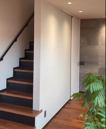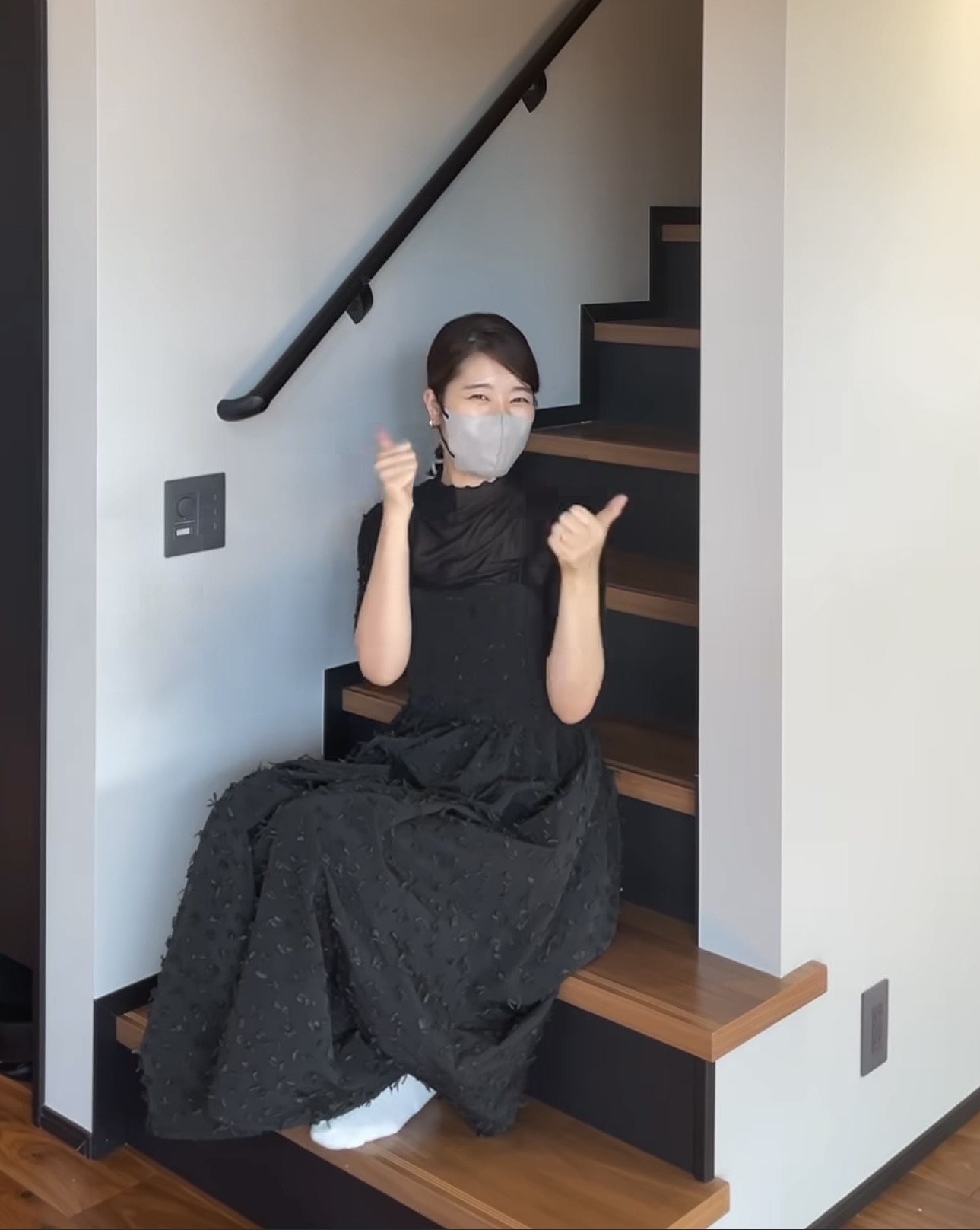 屋根裏収納に上がる階段なんだけど、壁が2段目のステップから始まっているの、わかるかな?